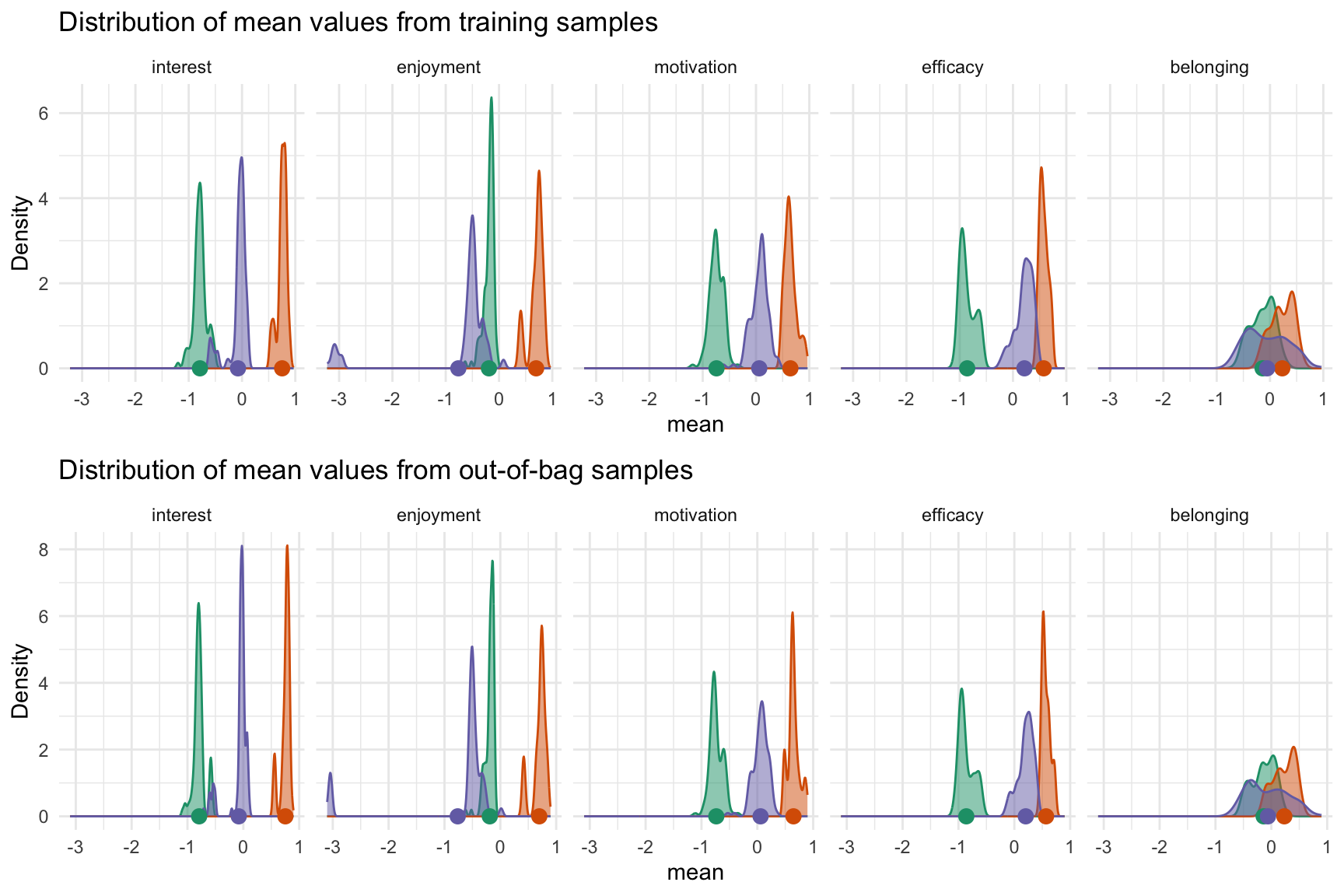 The figure below provides an alternative approach for determining stability by plotting the distribution of means across clusters and variables. Ideally we would want the standard deviation of these distributions to be as small as possible.