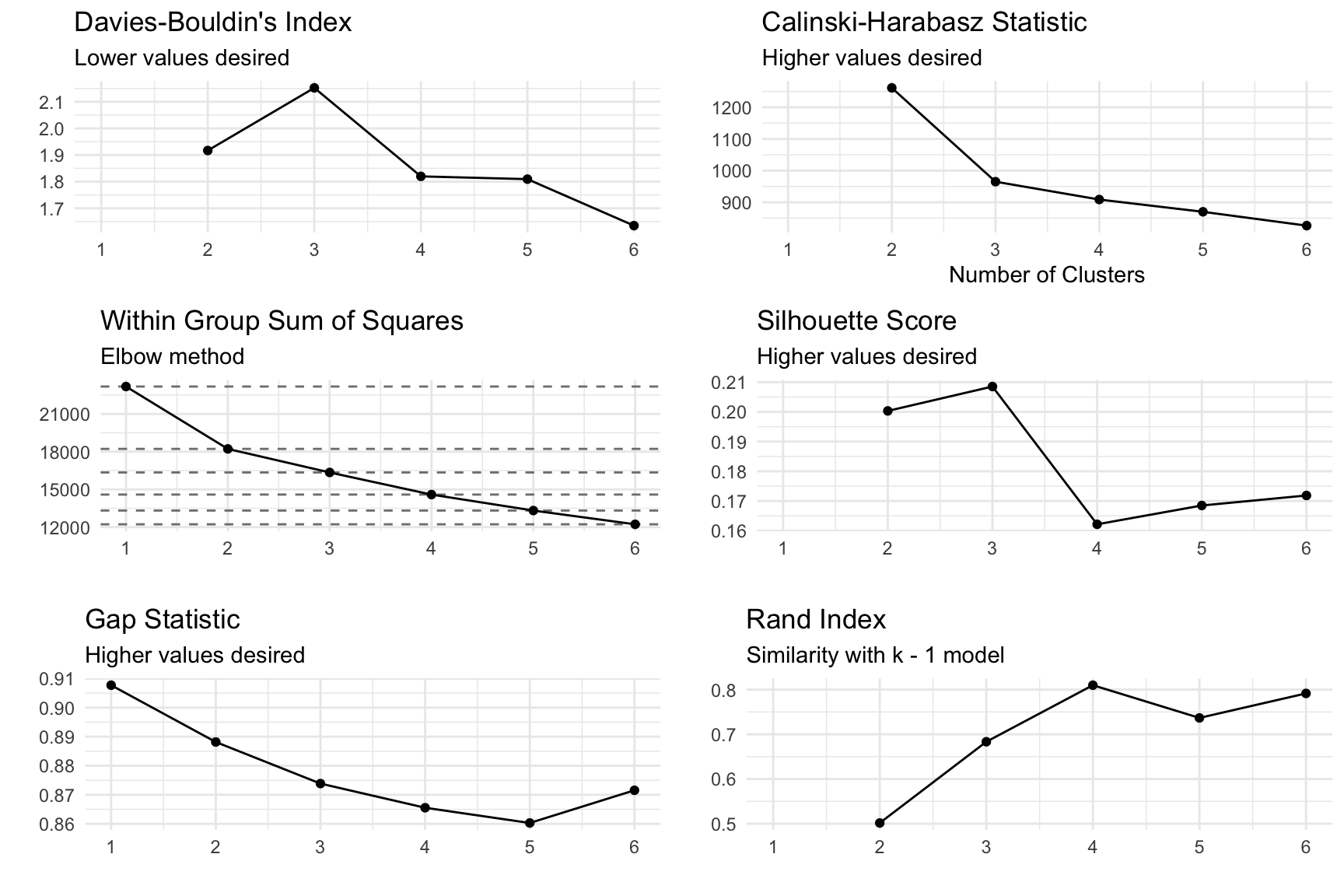 #> 6 6 12223.82 0.1718593 0.8715511 826.2544 1.634673 0.7914534Davies-Bouldin Index (1979) - DBI is a metric used to evaluate the quality of a cluster analysis by measuring the compactness of clusters and their separation from each other. A lower DBI indicates better clustering, with well-separated and compact clusters.
