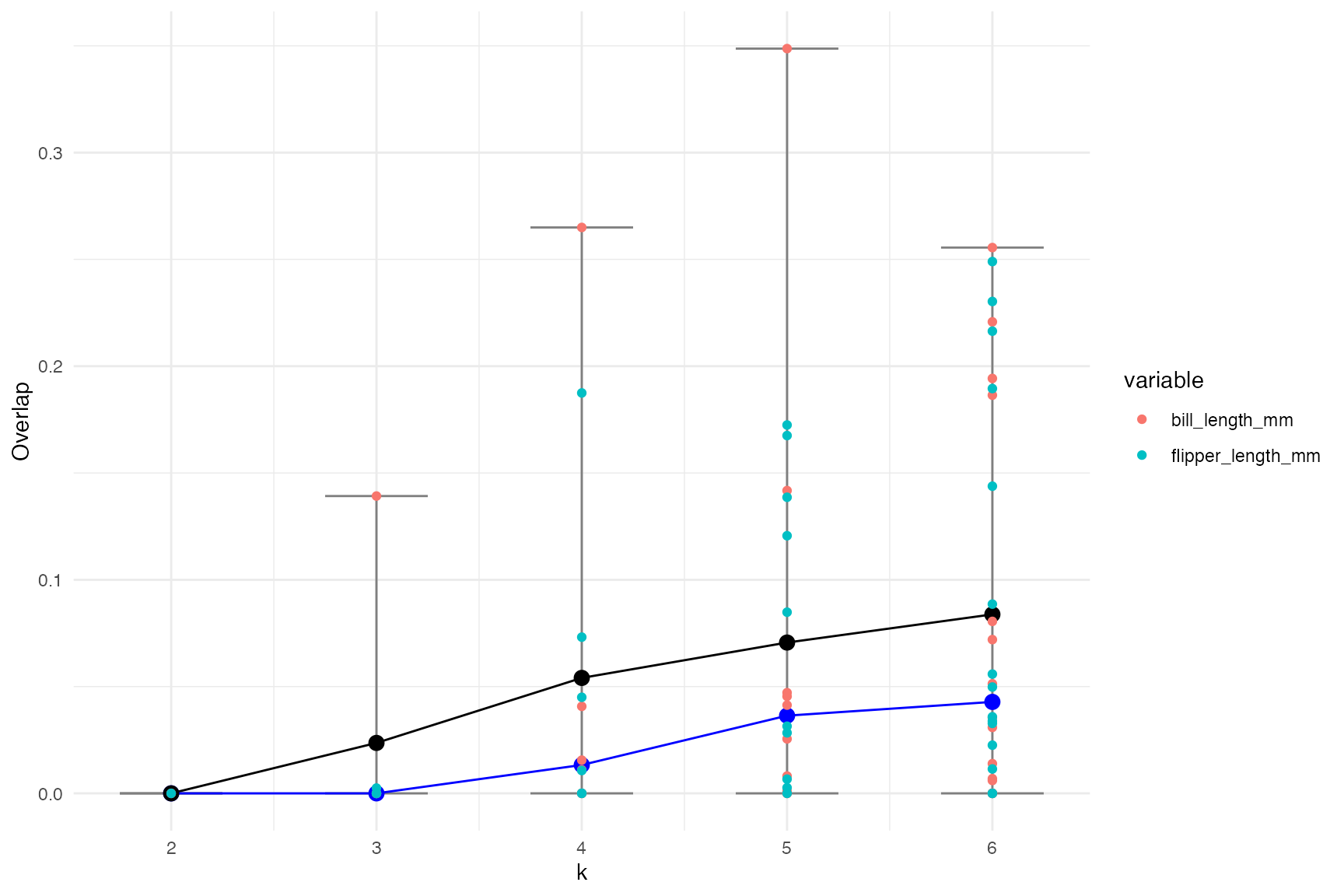 overlap <- overlap_fits(df = penguins[,cluster_vars])The figure below shows the mean (in black) and median (in blue) overlap. The individual points correspond to the overlap for each variable and cluster combination (colored by the variable). Couple of observations from this plot: